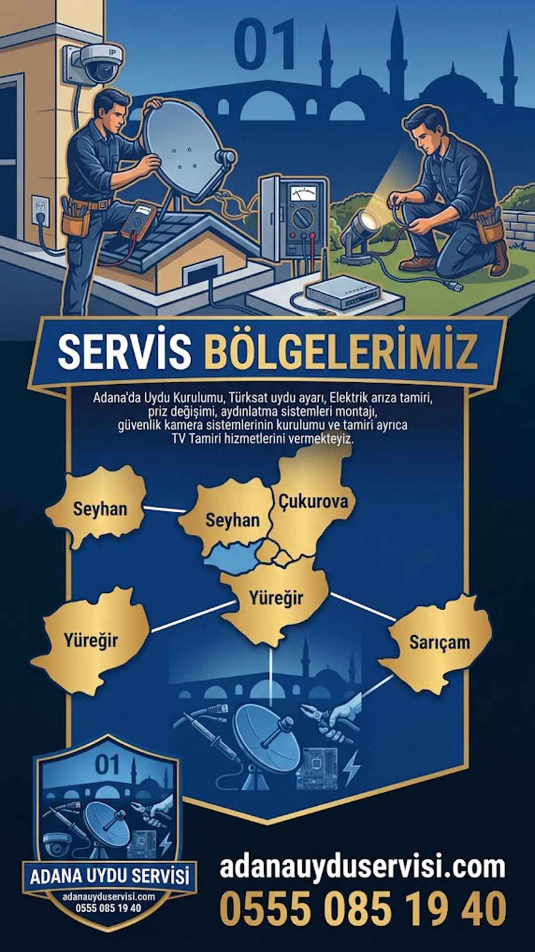 Adana Tv Tamir Servisi olarak Seyhan, Yüreğir, Çukurova ve Sarıçam ilçelerinde Led Tv Tamiri, Led Televizyon Tamiri, Adana Televizyoncu olarak sizlere hizmet vermekten mutluluk duyacağız. Sizlerde profesyonel tv tamiri hizmetimizden yararlanmak için haftanın 7 günü bizlere 0555 085 19 40 numaralı Adana Led Tv Destek Hattımızı arayarak ulaşabilir aynı gün uydu, tv tamiri, tv kurulum ve uydu arızalarının tamiri konularında yardım alabilirsiniz. Bizi aramaktan çekinmeyin.