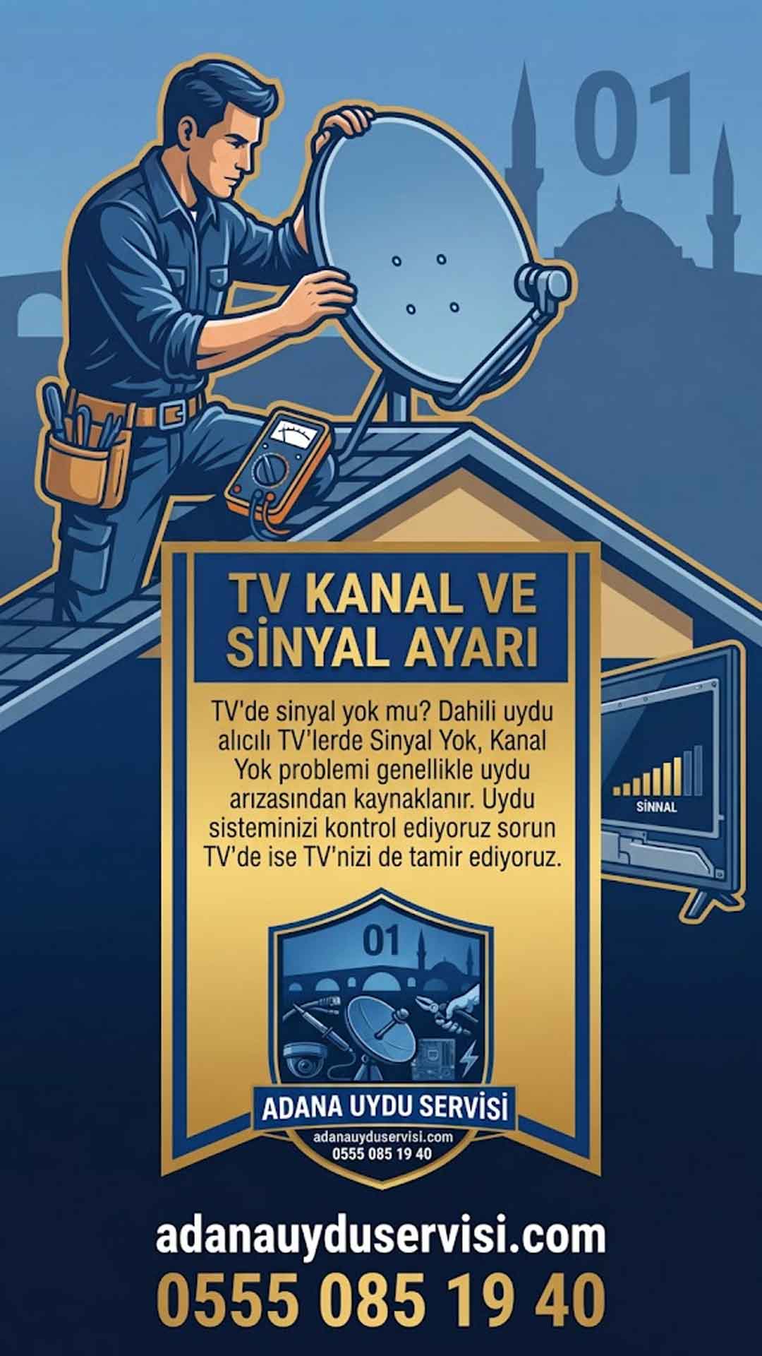 Televizyonunuzda “Sinyal Yok” uyarısı mı alıyorsunuz? Dahili uydu alıcılı TV’lerde karşılaşılan kanal kayıpları ve sinyal problemleri genellikle dış ünite (çanak anten, LNB veya kablo) kaynaklıdır. Adana’da her marka televizyonunuz için **TV Kanal ve Sinyal Ayarı** hizmeti veriyoruz. Uydu sisteminizi titizlikle kontrol ediyor, sorun televizyonunuzda ise yerinde tamir desteği sağlıyoruz.